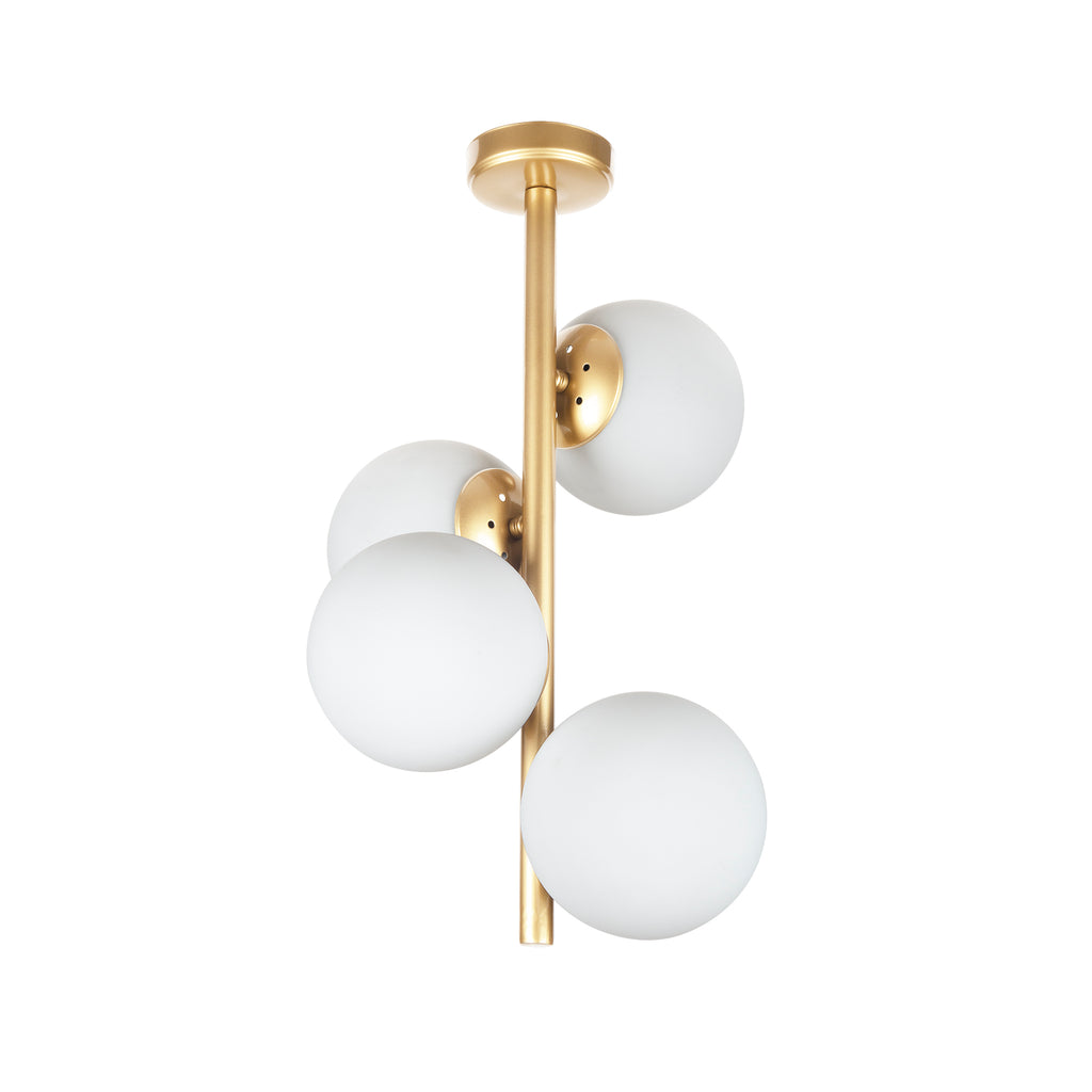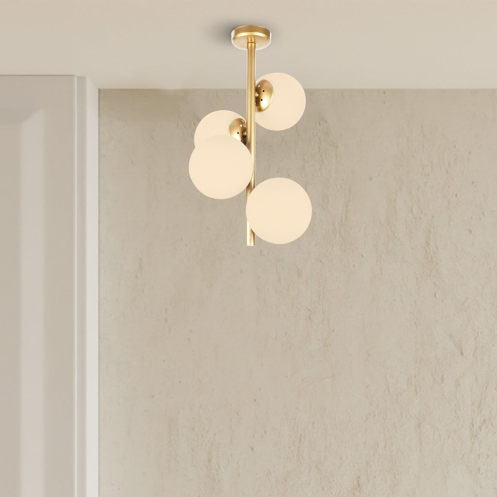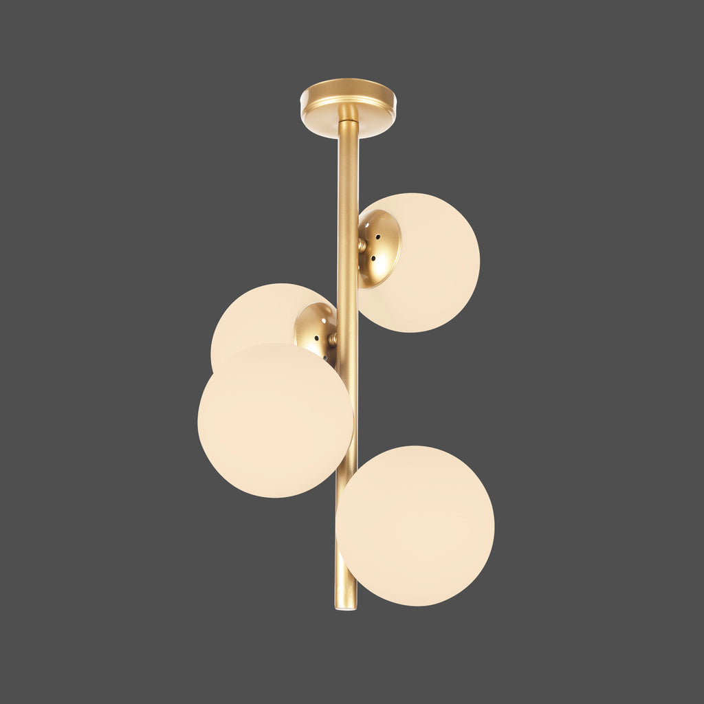 The Owl Gold chandelier captivates with its contemporary and elegant design, featuring luminous globes arranged vertically on a sleek metallic structure with a golden finish.